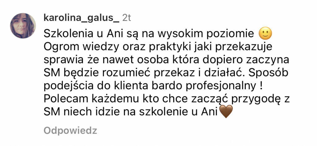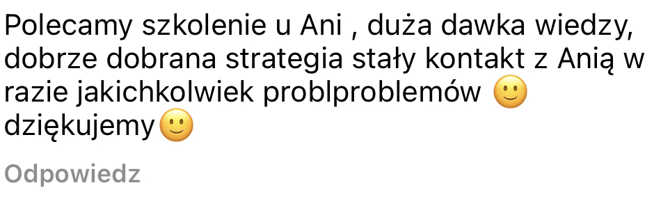 Mam na swoim koncie ponad 400 osób, które przeszkoliłam z zakresu SOCIAL MEDIA, dziś moi klienci prowadzą swoje biznesy i właśnie wykorzystują w nich media społecznościowe. Dobra wiedza to podstawa. Kilkadziesiąt firm, którym pomogłam wyjść na prostą w social media a także szkolenia grupowe.